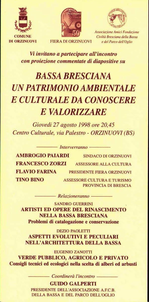 ANNO 1998 21.Marzo CREMONA:visita guidata agli affreschi del Duomo ed alla Pinacoteca. ============================================================= 19.Aprile BRESCIA :visita al centro storico relatori: D.Paoletti e G.Ghilardi ============================================================= 10.Maggio Fenili Belasi: Villa Bellasi e la parrocchiale. Capriano del Colle:visita a PalazzoBocca , alla parrocchiale e alla cascina Colombaie. relatore: S.Guerrini Conclusione con la visita alla cantina Poli ( Capriano d/C DOC.) ============================================================= 31.Maggio Cigole- Palazzo Martinoni ed il caseificio Zani. Pomeriggio; Milzano- visita al paese, a palazzo Udeschini (ora Brunelli) ed alla parrocchiale. Relatrice: Bruna Viscardi ============================================================= 27.Agosto Orzinuuovi- Centro Culturale di Via Palestro. Bassa Bresciana: Un patrimonio ambientale e culturale da conoscere e valorizzare Relazioni di Sandro Guerrini, Dezio Paoletti, Eugenio Zanotti Programma>> | |||